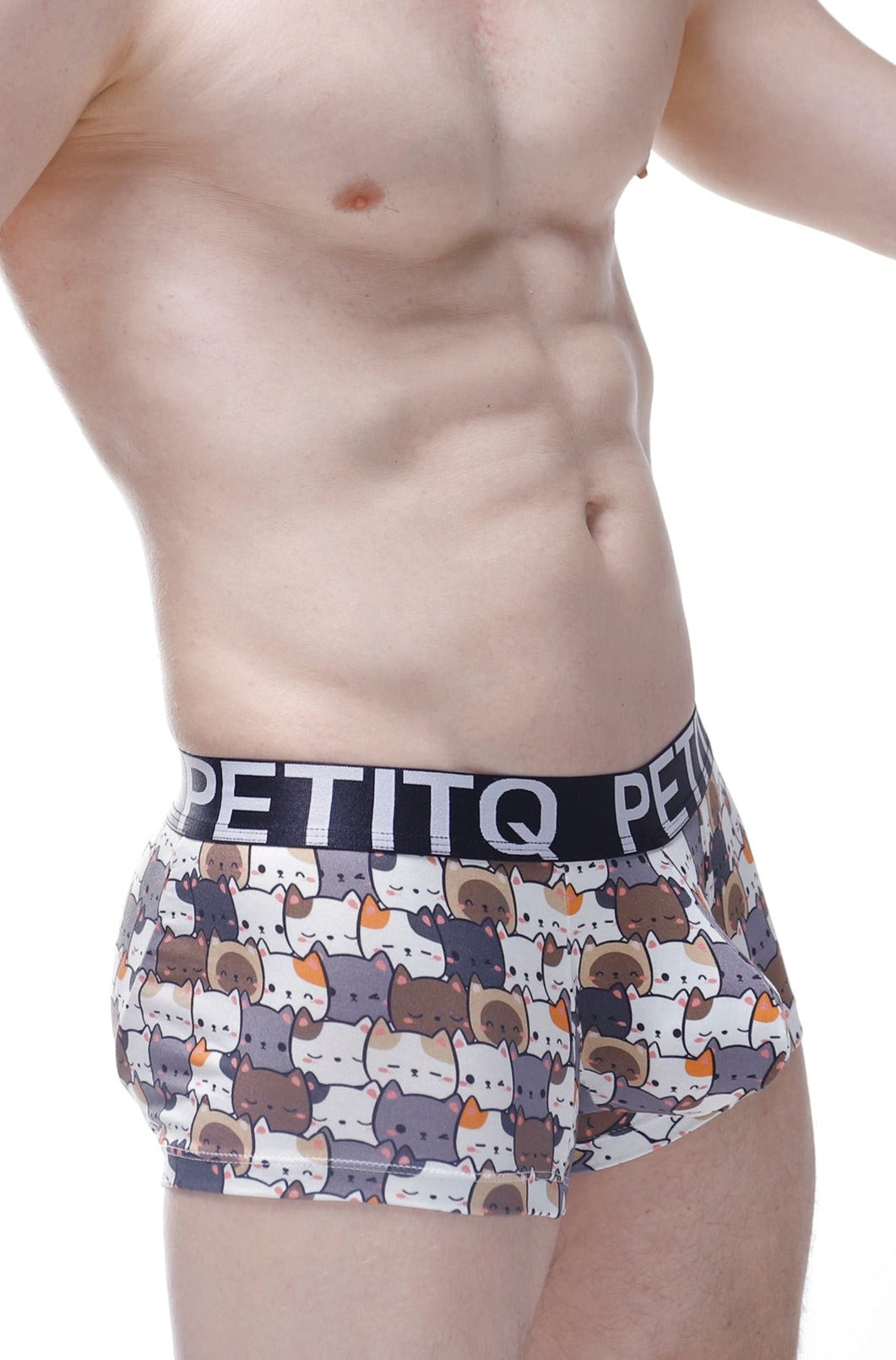 Der Protruder ist ein Gummiband in der Fronttasche, das Sie um Ihr Paket legen, um es größer zu machen. Er ist abnehmbar, sodass Sie ihn nicht jeden Tag tragen müssen. Diese Boxershorts sind aus weichem Modal mit kleinen Katzen überall und einem schwarzen PetitQ-Bund.