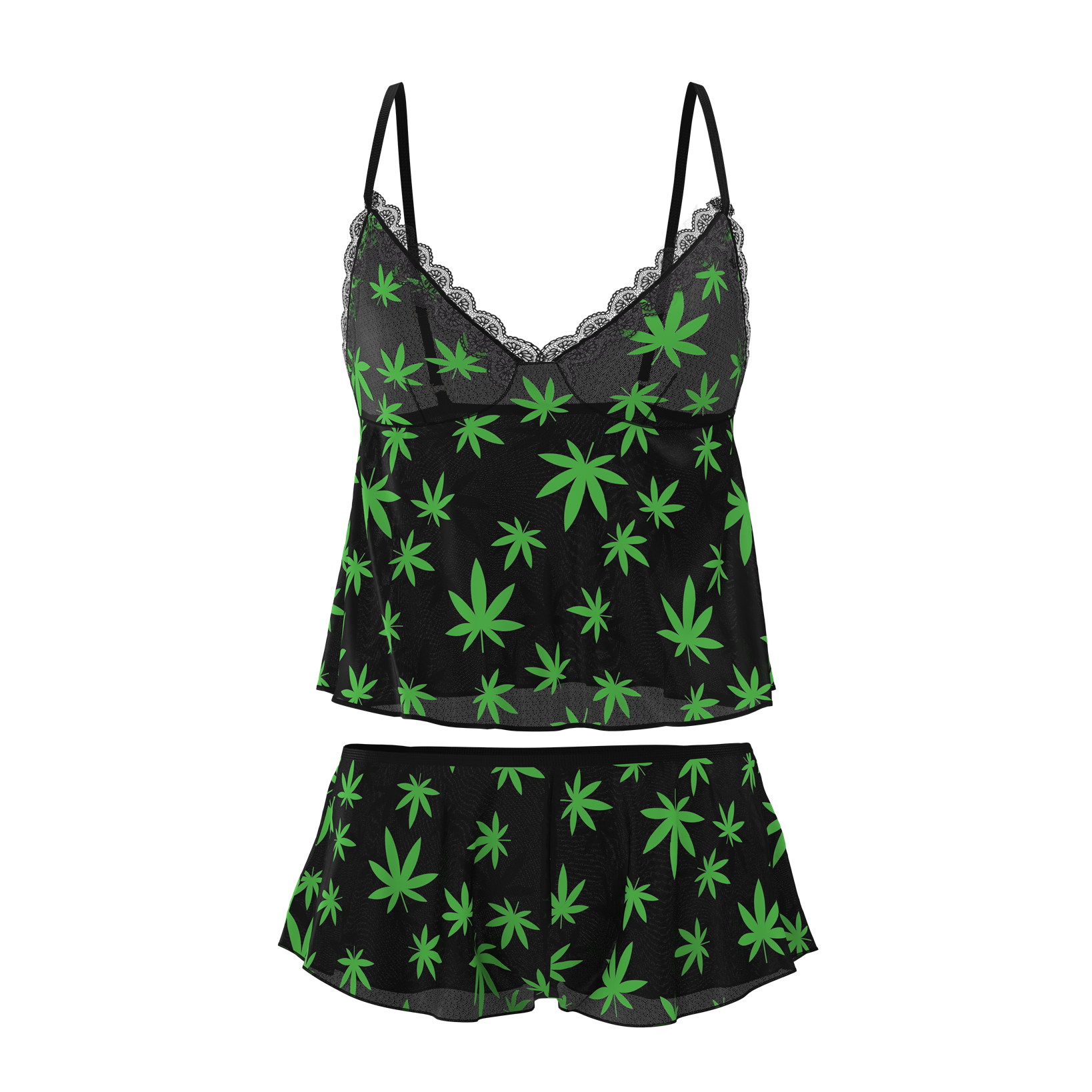 Entdecken Sie das bezaubernde Flowy Cami & Short Set aus der Exposed by Magic Silk Kollektion. Dieses bezaubernde Damen-Dessous-Set besteht aus einem fließenden Camisole aus schwarzem Netzstoff, verziert mit schwarzlichtreaktiven Designs in zwei leuchtenden Farben: neongrüne Hanfblätter und regenbogenfarbene Zauberpilze. Die verstellbaren Träger mit goldfarbenen Schiebern und linken Kanten sorgen für einen bequemen und individuellen Sitz. Zusammen mit den passenden Mesh-Minishorts ergibt dieses Set einen mutigen und verspielten Look. Perfekt für alle, die ihrer Kollektion einen Hauch von Verspieltheit verleihen möchten: Dieses Set aus Camisole und Damenshorts ist komfortabel und stilvoll. Werten Sie Ihre Dessous-Garderobe mit diesem einzigartigen Damen-Dessous-Set auf und setzen Sie ein Statement.