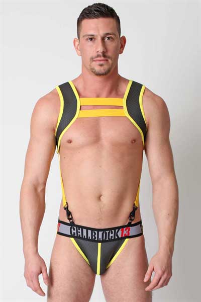Die Bilder zeigen das elegante Design des Jockstrap mit einer kräftigen gelben Verzierung, die einen schönen Kontrast zum dunklen Neoprenmaterial bildet. Die verstellbaren Riemen sorgen für eine perfekte Passform, während das CellBlock 13-Logo für einen zusätzlichen Hauch von Stil sorgt. Das Modell zeigt, wie dieser Jockstrap mit anderen Accessoires kombiniert werden kann, um einen kompletten, umwerfenden Look zu kreieren.
