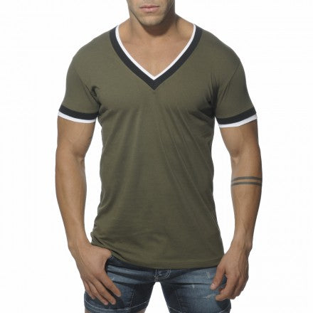Entdecken Sie die perfekte Mischung aus Stil und Komfort mit dem kurzärmligen T-Shirt mit doppeltem V-Ausschnitt aus der ES Collection in vielseitiger Khakifarbe. Dieses T-Shirt aus 100 % feinster Baumwolle fühlt sich weich und atmungsaktiv an und sorgt dafür, dass Sie sich den ganzen Tag lang wohl fühlen.