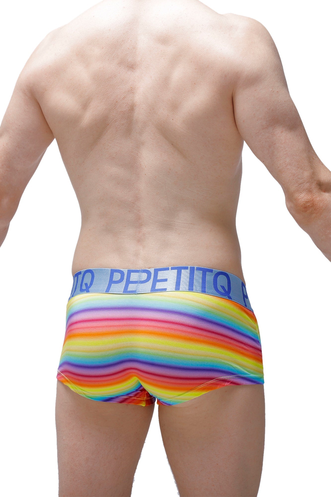 Slip sexy aux lignes arc-en-ciel lumineuses, ouvert sur le devant avec une pochette amovible en filet jaune fluo.