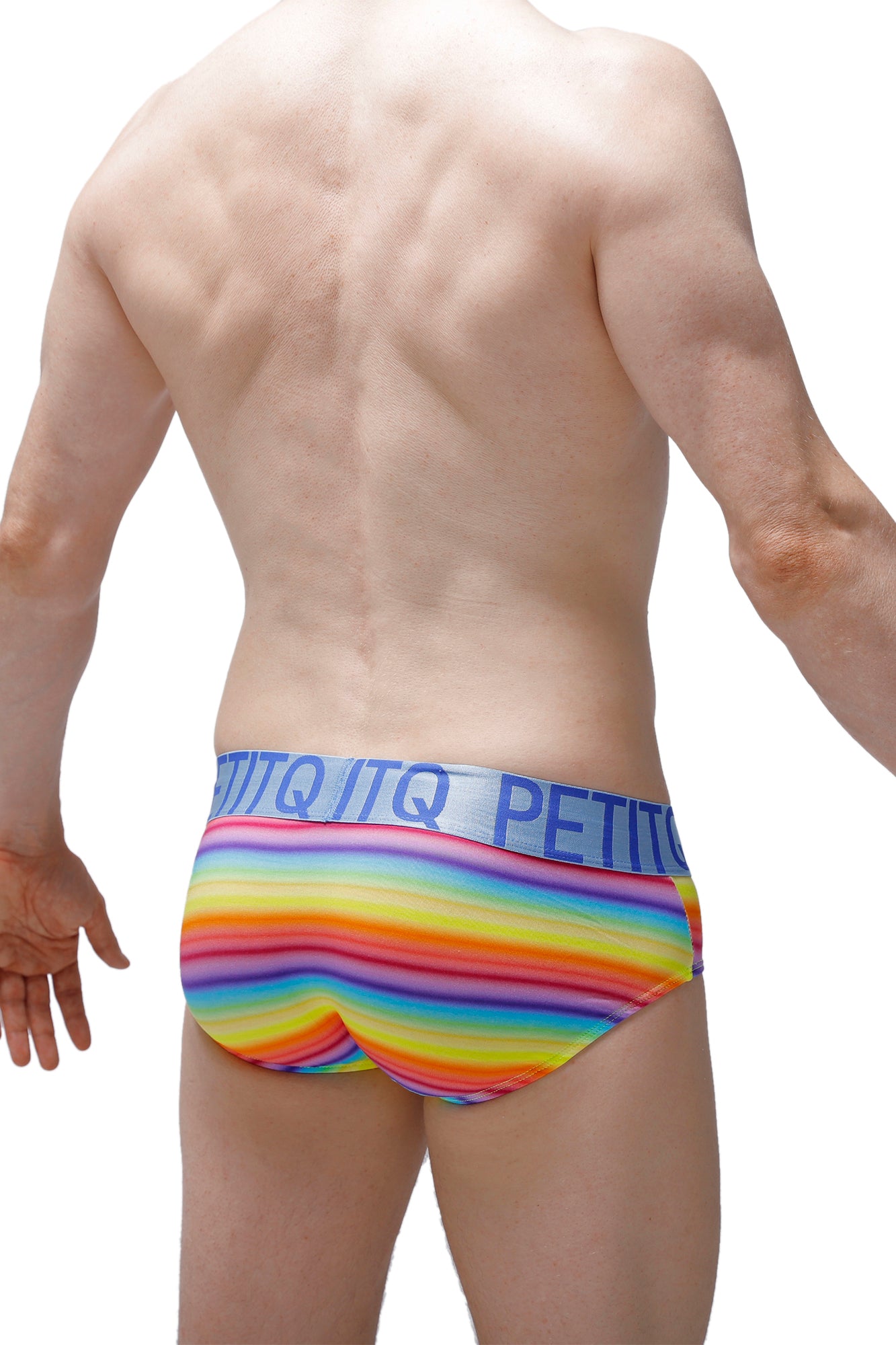 Slip coloré aux lignes arc-en-ciel et juste la poche frontale en filet transparent pour montrer juste ce qu'il faut. De fins élastiques à l'avant pour une touche sexy supplémentaire.