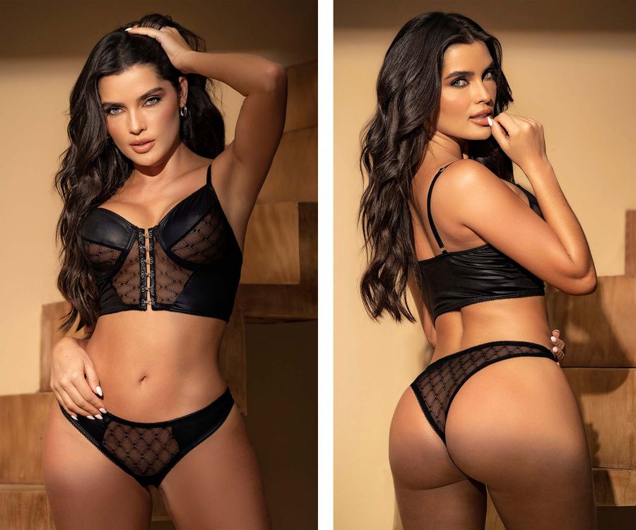 Les images mettent en valeur le design exquis de l'ensemble deux pièces Mapale 8778. Le modèle respire la confiance et l'élégance, mettant en valeur les détails complexes du haut bustier et la coupe flatteuse de la culotte assortie. Le tissu effet mouillé et les contrastes de maille géométrique créent un effet visuellement époustouflant qui ne manquera pas de faire tourner les têtes.