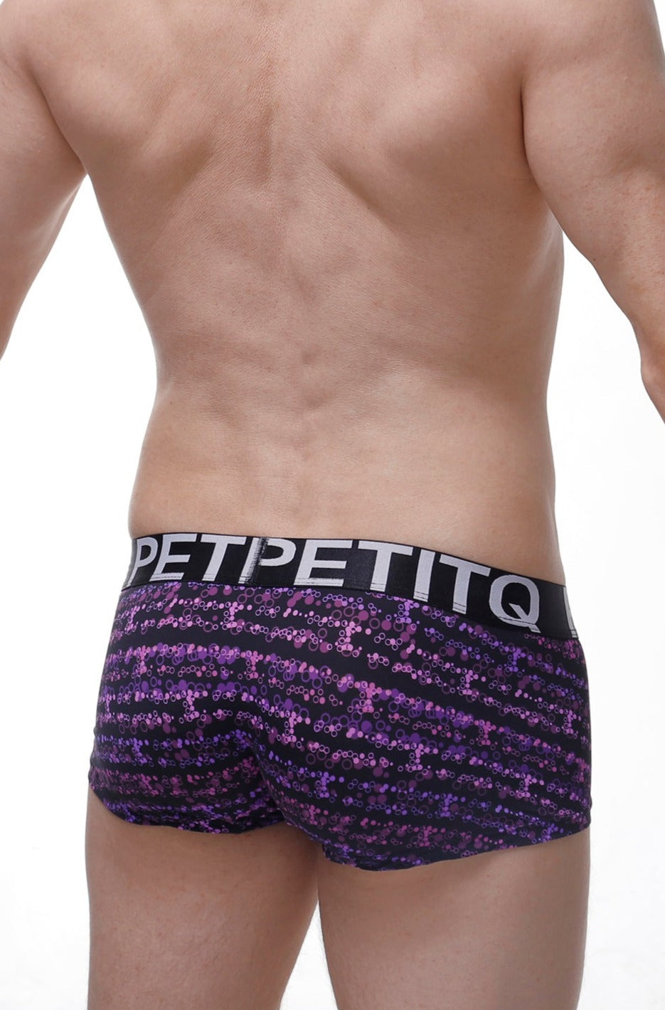 Black boxer with a nice frontal pouch and a nice pattern of pink and purple little bubbles.