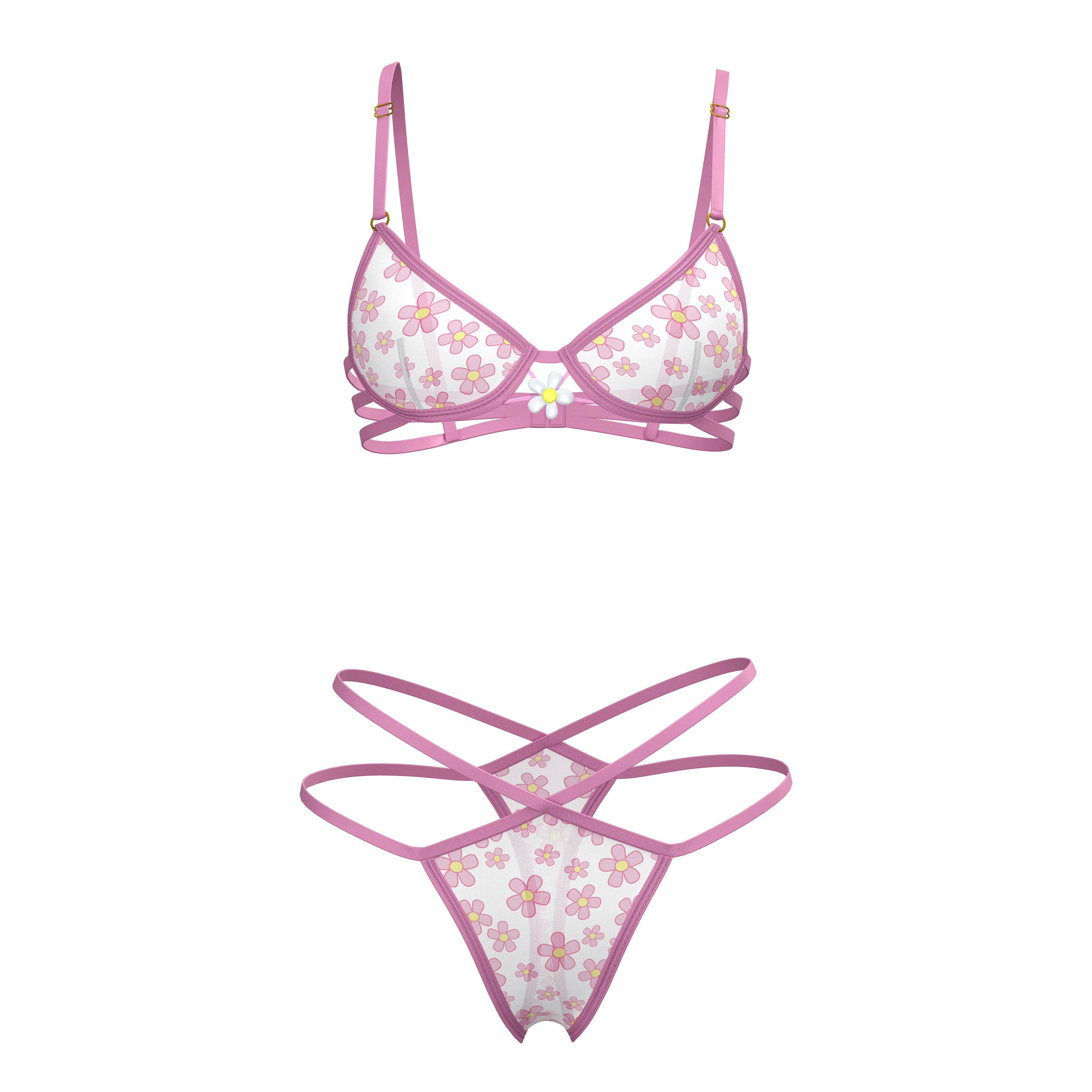 The Bra and Thong Set from the Exposed by Magic Silk collection is now available. This captivating women's lingerie set features a blacklight reactive retro daisy print, designed to light up the night. The mesh bra boasts daisy beads, looped elastic details with bright lilac elastics, adjustable shoulder straps with gold-tone sliders, and a hook & eye closure at the back. Paired with a matching high-rise strappy thong, this set offers a perfect blend of style and comfort. Elevate your lingerie collection with this stunning bra and thong set, designed to make a bold statement.