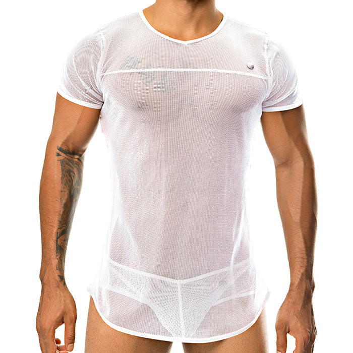 This short-sleeved t-shirt features a sleek, modern design with a semi-transparent mesh that adds a bold touch to your outfit. The white color and fitted cut highlight your physique, making it an excellent choice for those who want to make a statement. Whether you're heading out for a casual day or a night out, this t-shirt is versatile enough to suit any occasion.