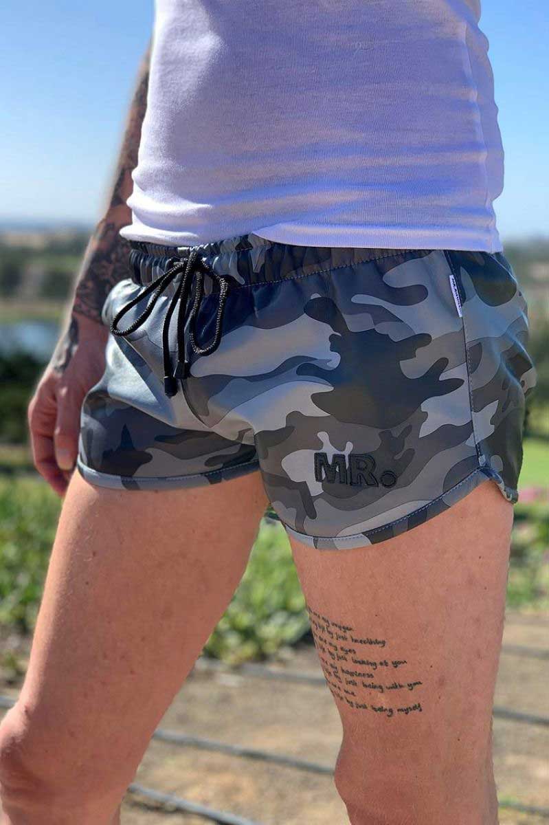 Don't miss out on this exclusive opportunity to own a pair of Mr Riegillio MR Mini Shorts in grey camo. Order now and add a touch of bold style to your wardrobe!
