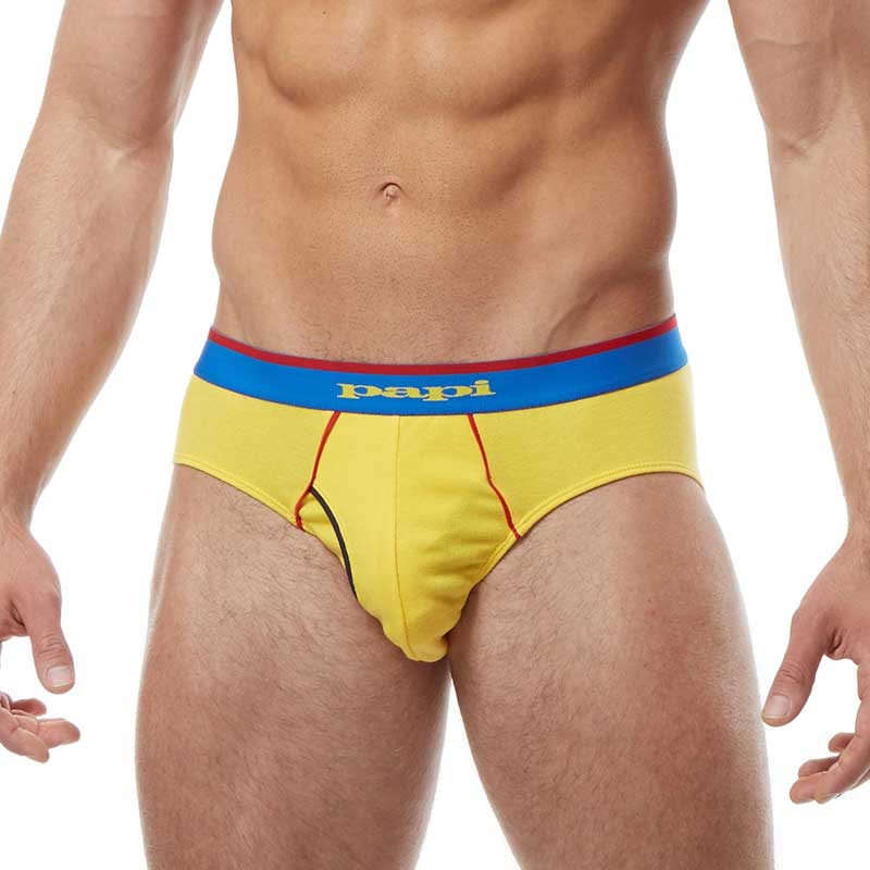 The images showcase the vibrant yellow brief with a bold blue waistband and red accents, highlighting the lively and sporty design. The Papi logo on the waistband adds a touch of brand recognition and style. The white and navy options offer versatility, making this 3-pack a must-have addition to your underwear collection.