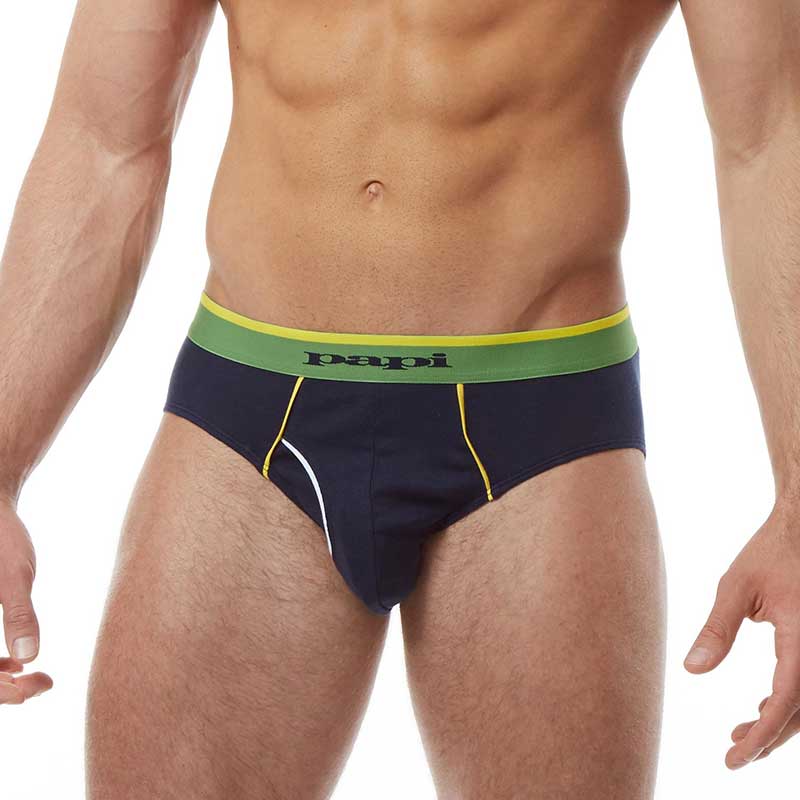 The Papi Heritage Clasico Hip Briefs feature a bold design with a green waistband and contrasting yellow stitching, adding a touch of vibrant style to your underwear collection. The pack includes three colors: white, heather, and navy, allowing you to choose the perfect pair for any occasion.
