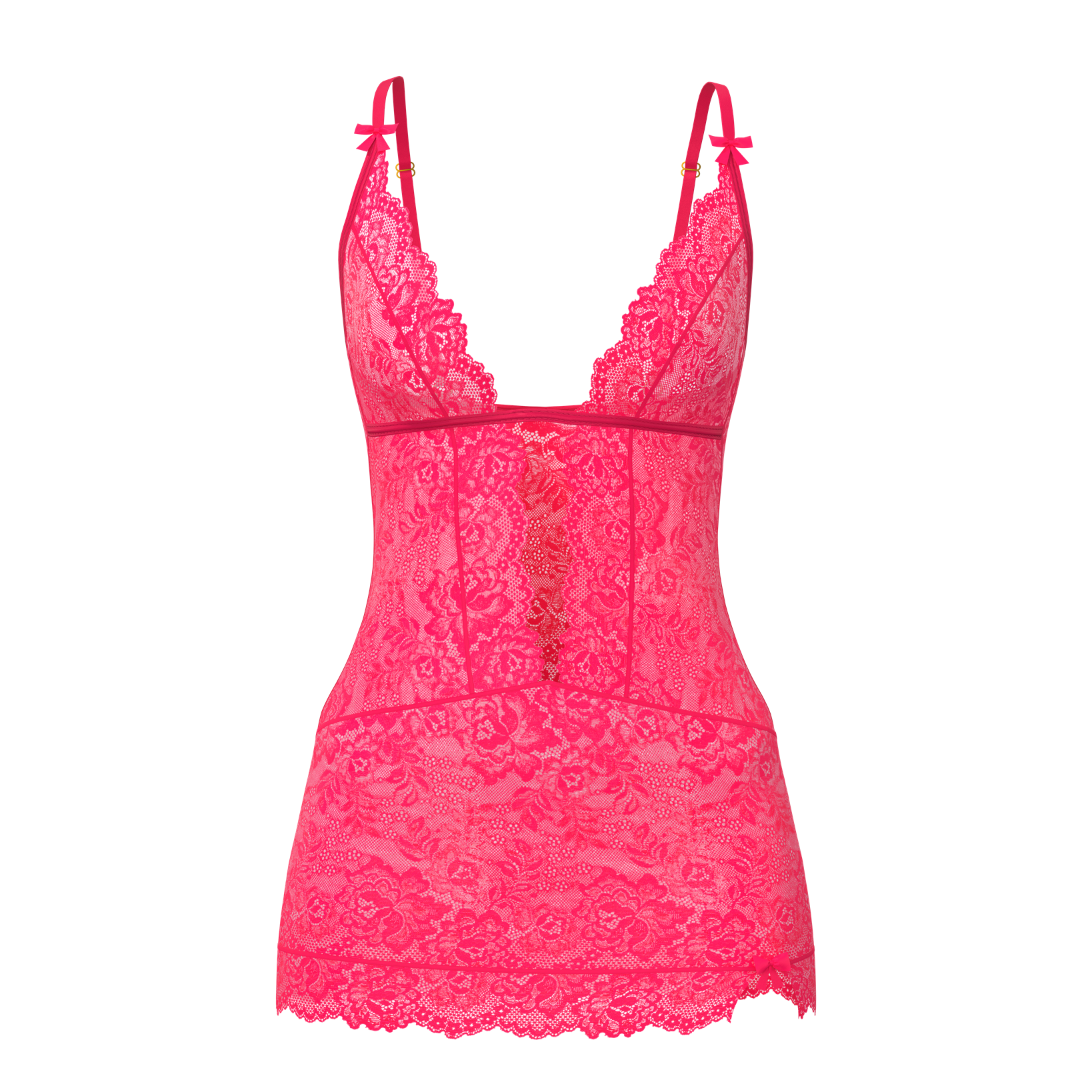 This style from the Exposed by Magic Silk collection features a stretchy lace chemise with a plunge neckline, adjustable shoulder straps adorned with satin ribbon bows and gold tone sliders, scalloped edges, and a matching g-string. It is designed to enhance your comfort and style. Our stretch lace galloons are strategically positioned to enhance the playful scalloped edges. They are expertly crafted with soft, shiny elastic strap details that add a touch of elegance. Additionally, these lace galloons are blacklight reactive, making them perfect for a fun and vibrant look.