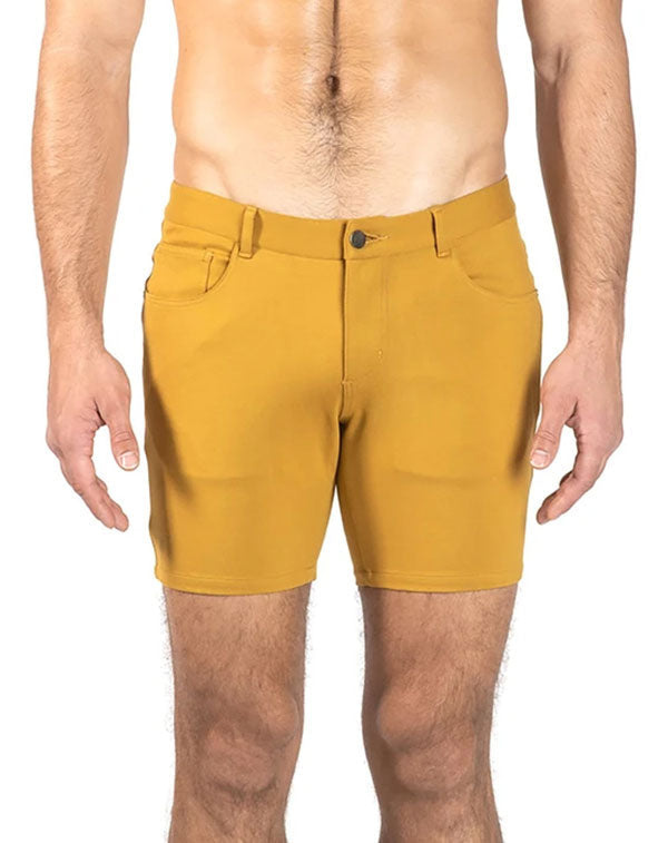 These shorts are perfect for a variety of occasions, whether you're hitting the beach, going for a casual stroll, or enjoying a night out. The Honey Gold color adds a pop of brightness to your wardrobe, making you stand out in any crowd.