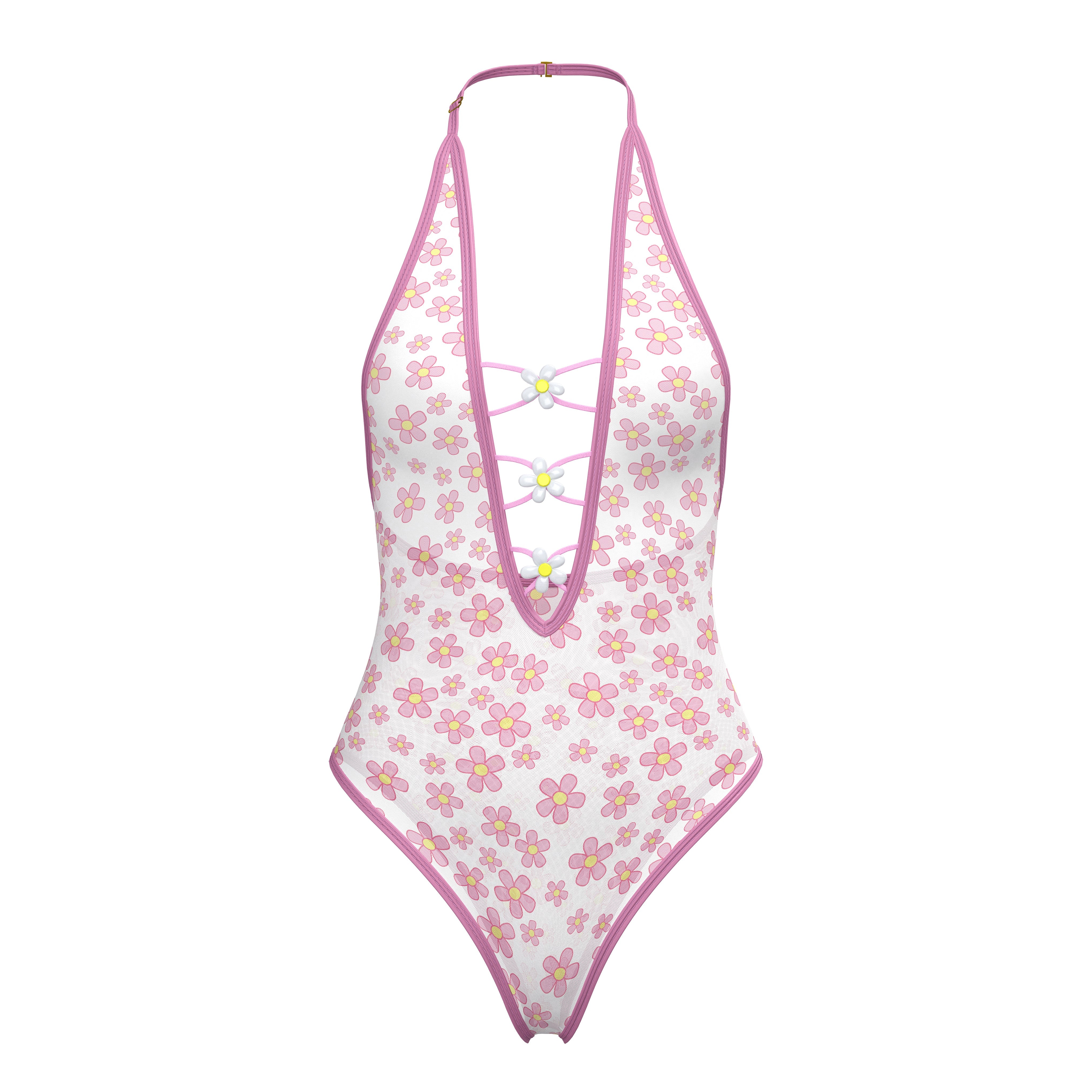 This style from the Exposed by Magic Silk collection features a mesh teddy with a blacklight reactive retro daisy print. It has a plunge neckline adorned with daisy beads and looped elastic detail with bright lilac elastics. The neck closure is a swan hook, and there is a snap closure at the crotch.