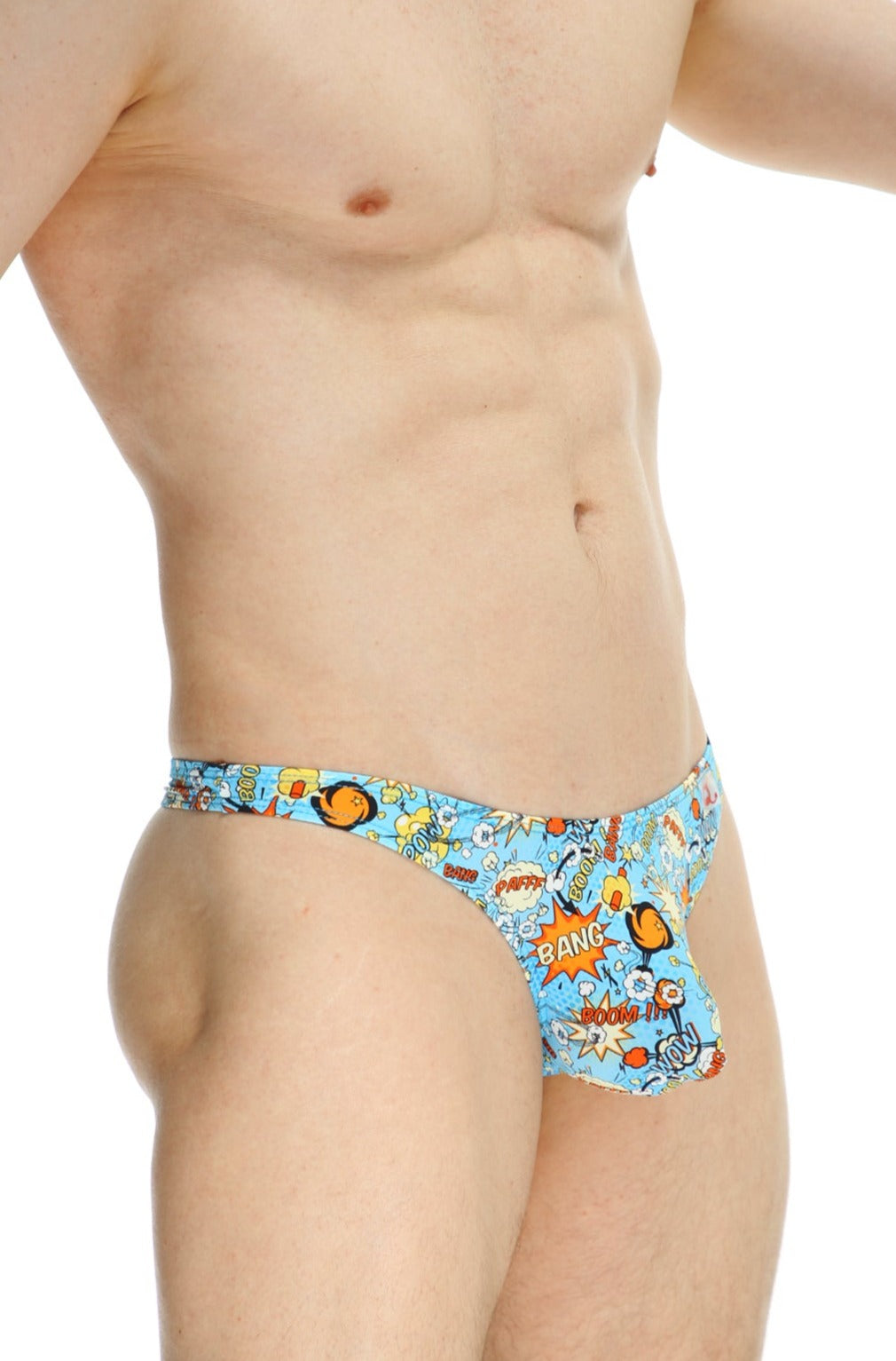 Comfortable men's thong with seamless frontal pouch and fun comic inspired pattern