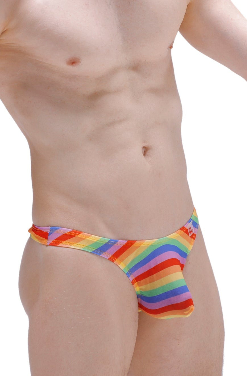 See-through??rainbow men's thong with seamless frontal pouch. Light rainbow stripes