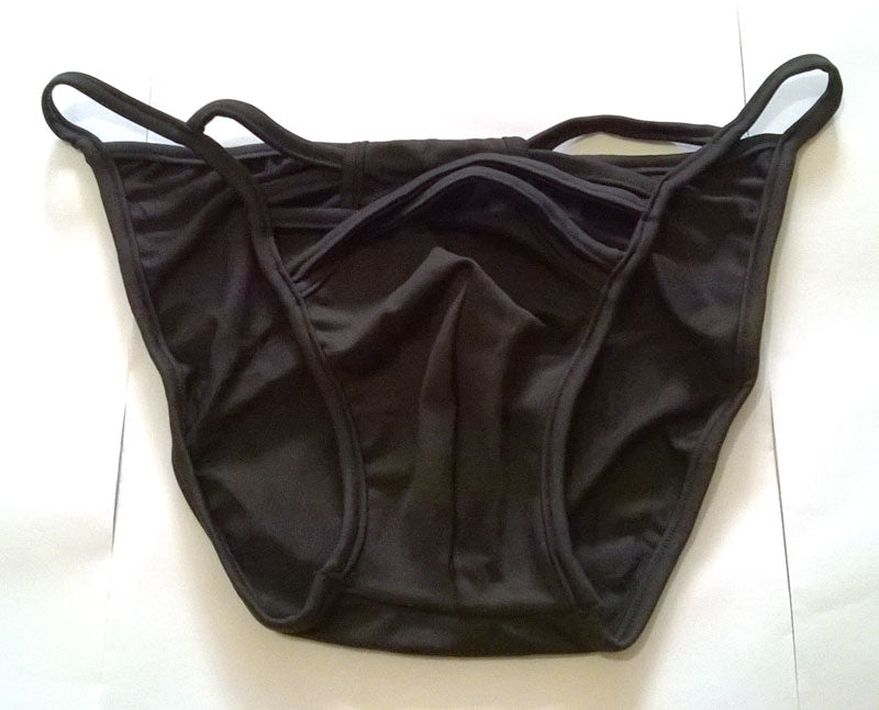 The images showcase the sleek black design of the bikini, highlighting the intricate strapwork and cutouts that make this piece stand out. The thin waistband string ensures a snug yet comfortable fit, perfect for any beach or poolside activity.